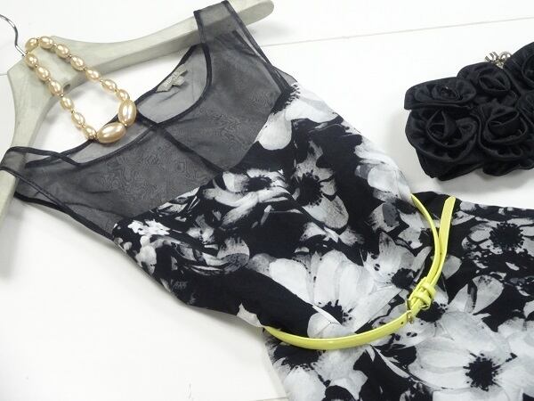 素敵なモ-ドの花柄ドレスワンピです。黄色のベルトがアクセント。デコルテ部分はレ-スになっていてセクシ-なデザインです。裏地有。脇下ファスナ-有。ベルト付。