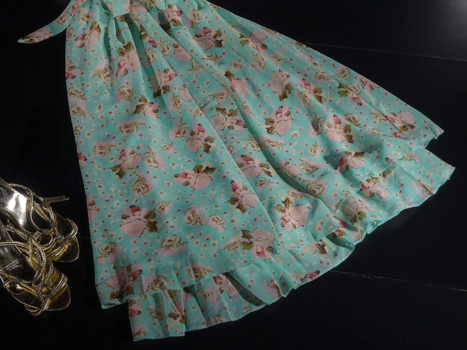 優雅に舞うシフォンマキシ丈のワンピース。さらさらとした生地全体にオレンジや黄色の暖色系を中心にパステル画のような花模様がプリントされています。ぷくんとした袖が可愛らしさをアップ。ウエストのリボンは右サイドに縫い付けられているので、なくしたりすることなく、すぐに結べます。ファスナーなしのかぶるタイプ。裏地付。
