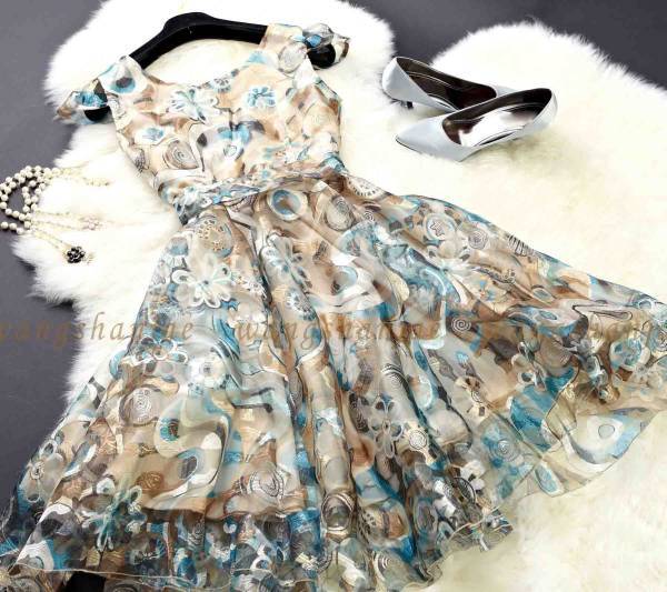 絵画のように美しい模様があしらわれた大変美しいワンピース。裾の透け感が優雅で上品な印象を与えています。ウエストで結ぶ共布のリボンがアクセントになっています。どんなシーンでも視線を独り占めしてくれる一枚です。裏地付き。サイドファスナー。ベルト取り外し可能。