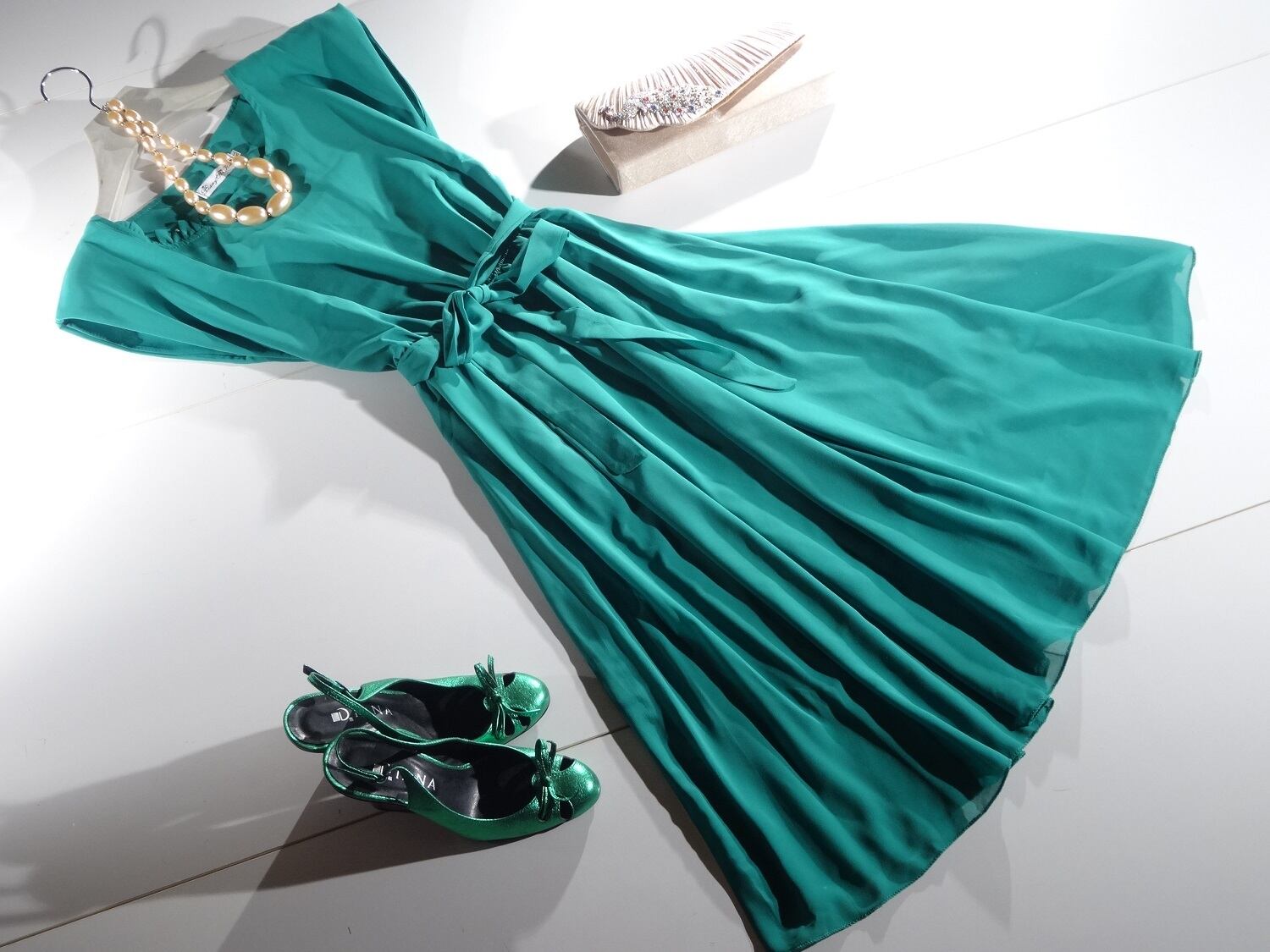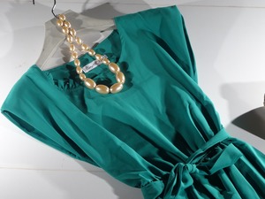鮮やかグリーンのロング丈ワンピース。襟繰りは中央から右のみフリルがあしらわれたユニークなデザイン。ウエストは総ゴムで伸縮性があり、共布ベルトを結べばシンプルなシルエットのアクセントに。裾にかけてたっぷり生地を使用し、フェミニンな印象を醸し出しています。ファスナーなしのかぶるタイプ。共布ベルト付。裏地有。