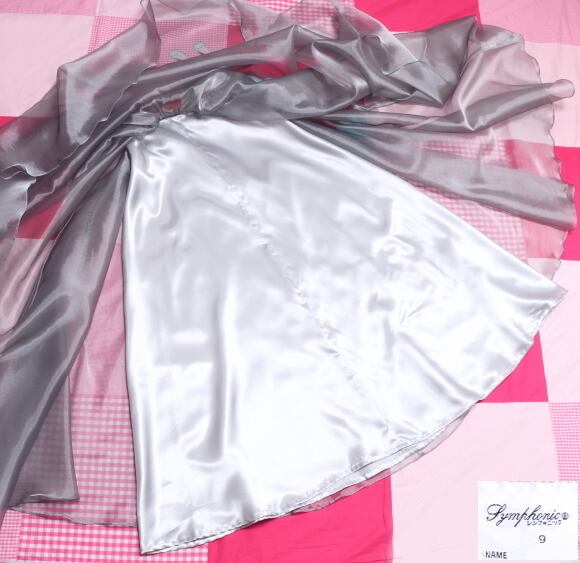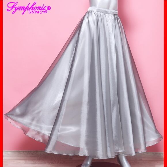 たっぷり白のオーガンジ-ロングフレア-スカートです。動きが優雅でゴージャスな印象に。コ-ラスに最適です。ウエストは両サイドゴム仕様、後ろファスナ-有。