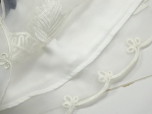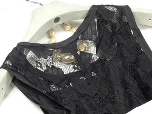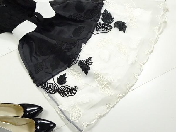 透け感が美しいレースとオーガンジーのワンピ-ス。トップスは黒地に花模様があしらわれたレース仕様。スカート部分は艶やかなオーガンジー仕立てで、黒の立体刺繍がアクセントになっています。ラウンドネックのワンピースとしても着用頂けますし、別添の白の付け襟を合わせると、また違った印象に。落ち着いたシックな色合いが上品で、清楚な雰囲気をかもしだしている一着です。透け感がありますのでインナー着用をお勧めします。付け襟。サイドファスナー。スカート部分裏地付。