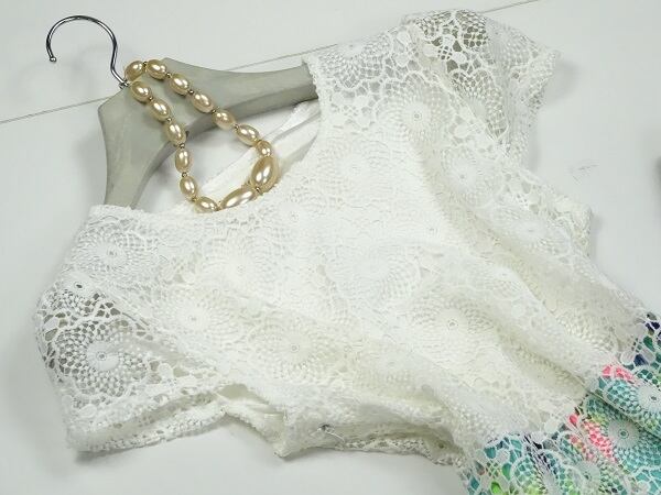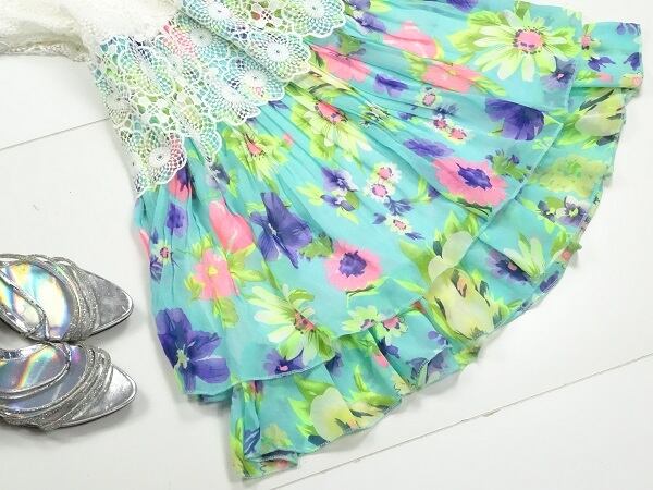 白地に爽やかなグリーンやピンク、赤の花模様がプリントされたスカート部分がプリーツ加工された涼やかなワンピースです。上見頃は花模様の刺繍レース。スカートとの切り返しがキュートなデザイン。ピュアで品の良い印象を与えてくれる一着です。サイドファスナー。裏地有。
