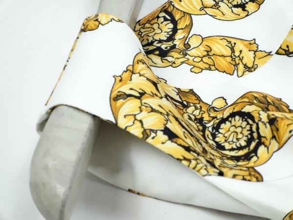 たっぷりと布地を使用したサ-キュラ-スカ-トがふんわりと広がり上品なシルエットを作りだしています。高級感のある色柄プリントが大人の魅力を引き立て女性らしいカッティングラインでスタイルよく着こなせます。ウエスト部分両サイドベルト通し用の糸があります。裏地なし。ベルト付。