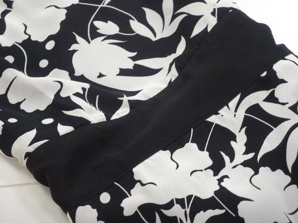 胸元部分のシフォンリボンがとてもエレガントで大きめの模様のサラリとしたシフォン素材のワンピ-スです。裏地有。