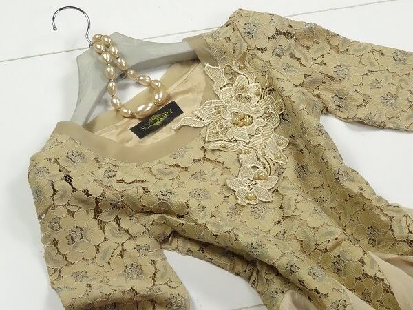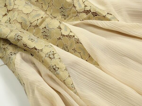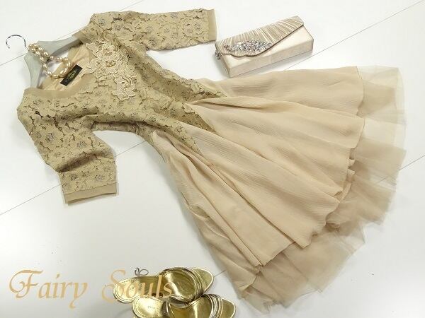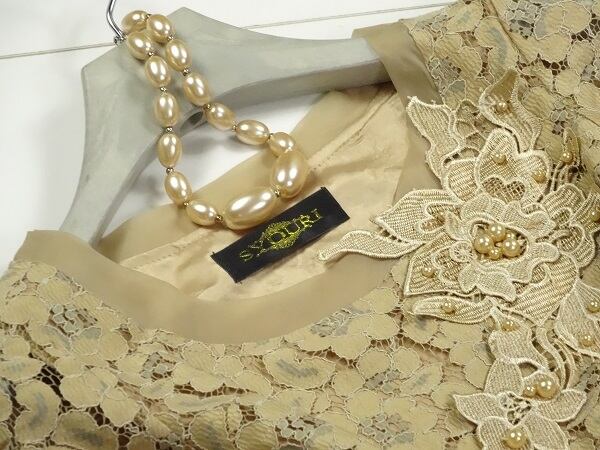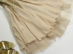 胸元のお花パ-ルがとても豪華でお顔を華やかに見せてくれます。ウエストから切り替えで流れるようなシフォンスカ-トが女性度UP!!結婚式やパ-ティ-にバッチリです。とてもエレガントな素敵な一着です。裏地付。