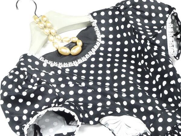白のドット柄が印象的なモノトーンロング丈のワンピース。襟もとと袖先、裾にはレースの縁飾り。裾とウエスト両サイドには艶やかな糸で立体的な刺繍が施されています。黒地に白のドット柄プリントされていて、シックと可愛らしさの両方をあわせもった魅力的な一着です。サイドファスナー。裏地有。