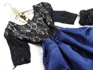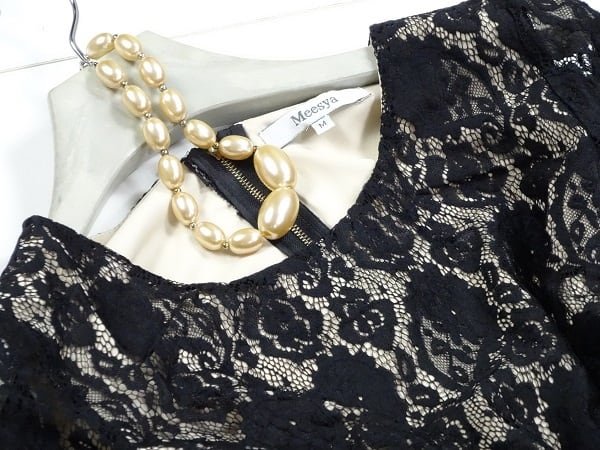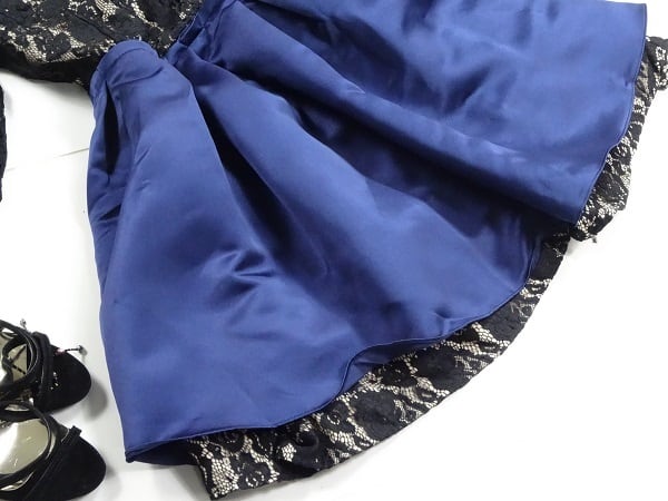 刺繍レ-スにサテンを重ね合したワンピースです。レースがとてもすてきで女性度UPです!!。背中ファスナ-有。裏地付。ネックレス付き。