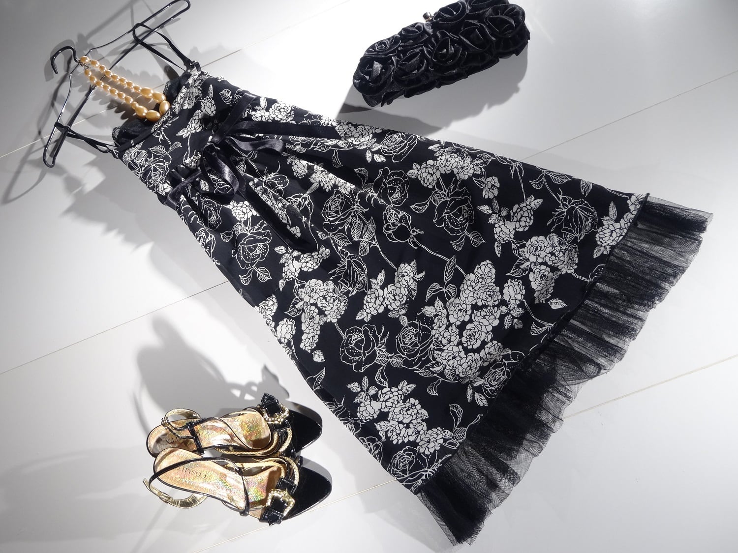 シックな黒地にグレーの花模様が全体にプリントされたキャミソールタイプのワンピース。胸もと中央でタックがとられ、ゆったりとした印象に。裾からは黒のチュール地がのぞいており、華やかさをアップ。キュートなシルエットにクールさをプラスした魅力的な一着です。ファスナーなしのかぶるタイプ。肩紐調整可。裏地あり。