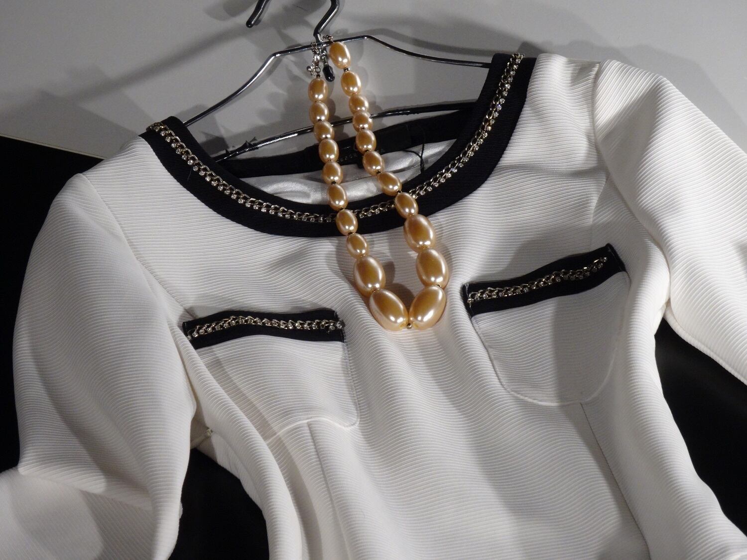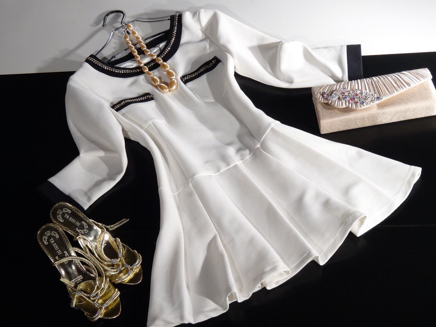 ウエスト切替箱プリーツとしっかりとした生地のツーピース風デザインのワンピース。襟元と胸元のポケットを縁取る黒とチェーンの飾りが、清楚なホワイトカラーにきりっとしたスパイスをプラスしています。デートやお呼ばれ、フォーマルなシーンにも重宝する一着です。サイドファスナ-有。胸元ポケット。裏地付。