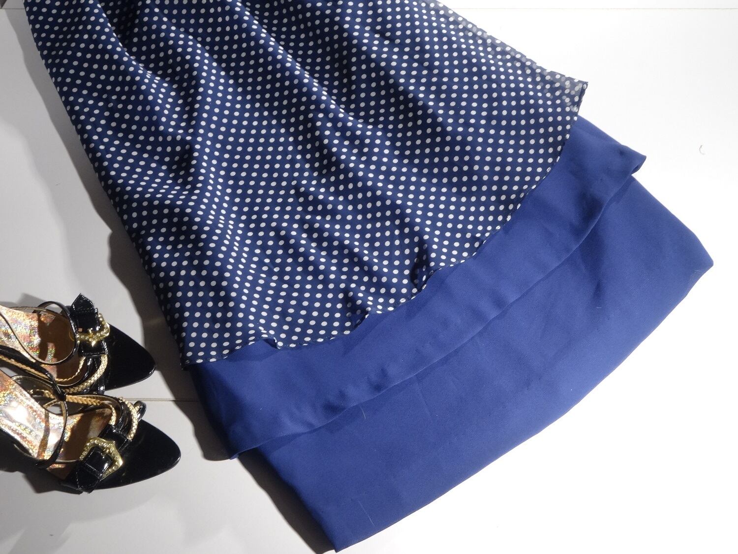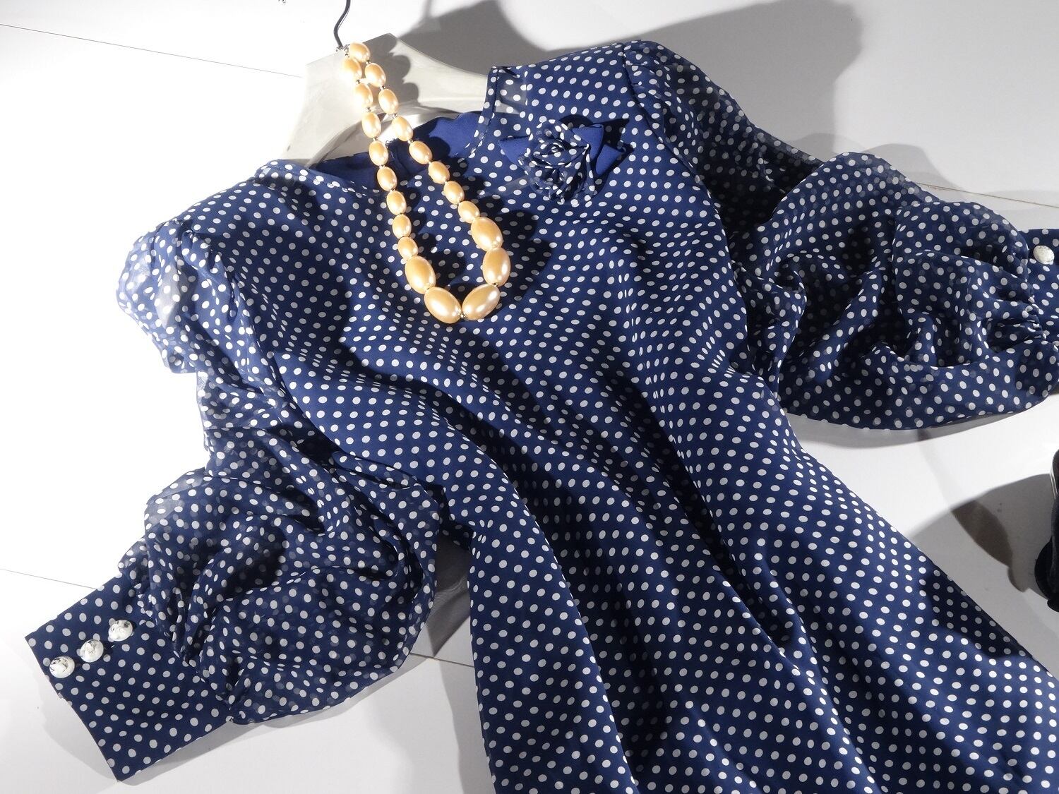 ドット柄の柔らか素材の重ね着ワンピです。ブロ-チ付(取り外し可能) 肩パット有。背中ファスナ-有。裏地あり。
