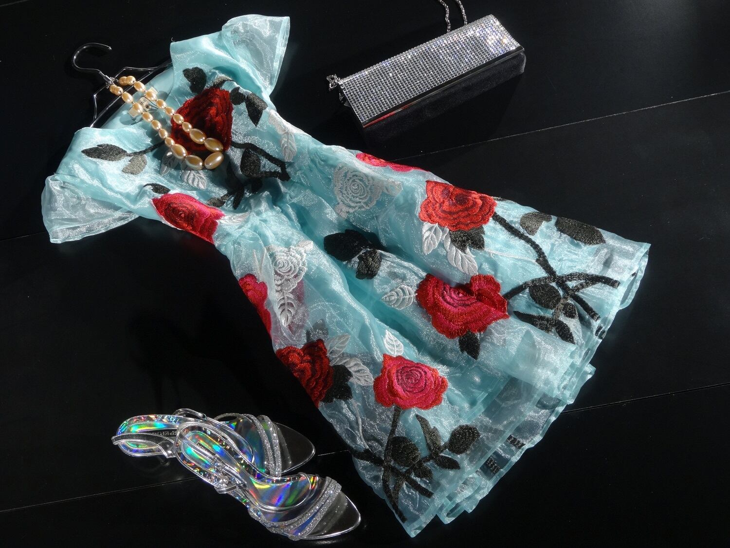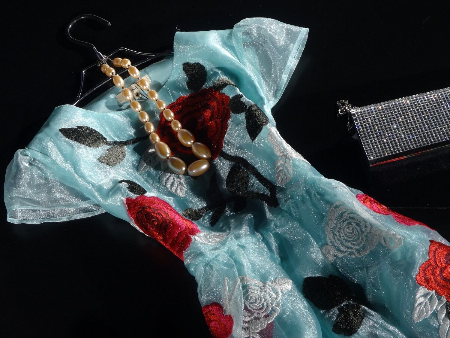 さわやかなペパーミントグリーンのオーガンジー生地に、鮮やかな刺繍糸で大ぶりの薔薇が刺繍されているワンピース。透け感のあるちょこんとした袖は、可愛らしく、また腕をスッと綺麗にみせてくれます。大変軽く、風を感じさせてくれる魅力的な一着です。左脇ファスナー。裏地あり。