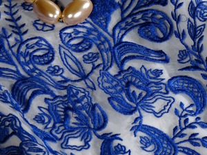 チュールの透明な上地にブルーの花模様が刺繍された繊細でピュア、透明感の美しいワンピースです。白のインナーキャミ付。