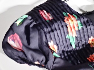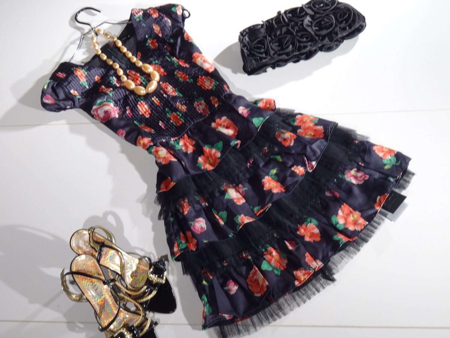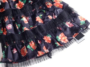 キュ-トな花柄と凝った縫製がとてもオシャレで、しぐさを優雅に見せてくれる贅沢なお洋服です。上半身の細かいギャザ-やパフスリ-ブが可愛らしく、スカ-トのティア-ドもたっぷりで甘い雰囲気を醸し出してくれます。背中にファスナ-有。裏地あり。