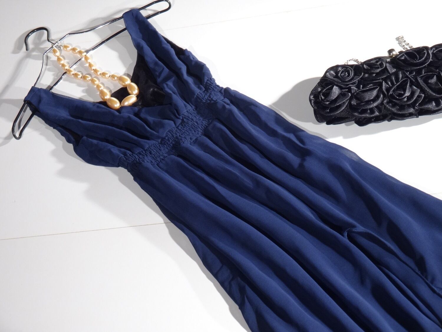 胸元をさりげなく魅せてセクシ-かつエレガントなシフォンワンピ-スです。背中部分も大胆にあいていますのでとても綺麗です。今期人気のマキシ丈ワンピなので結婚式や二次会はもちろん普段着にも最適の一品です。膝まで裏地有。