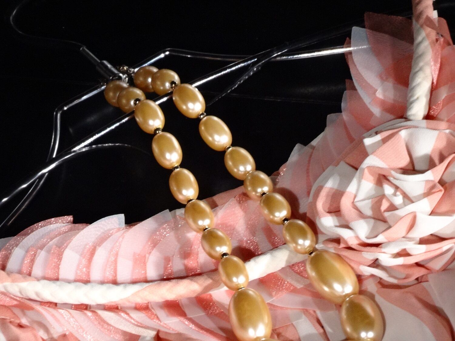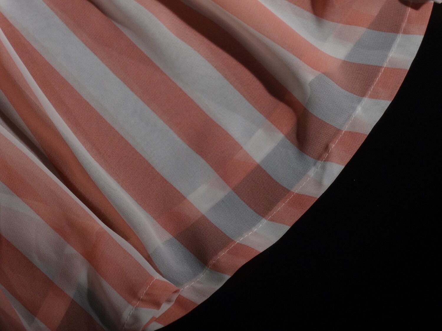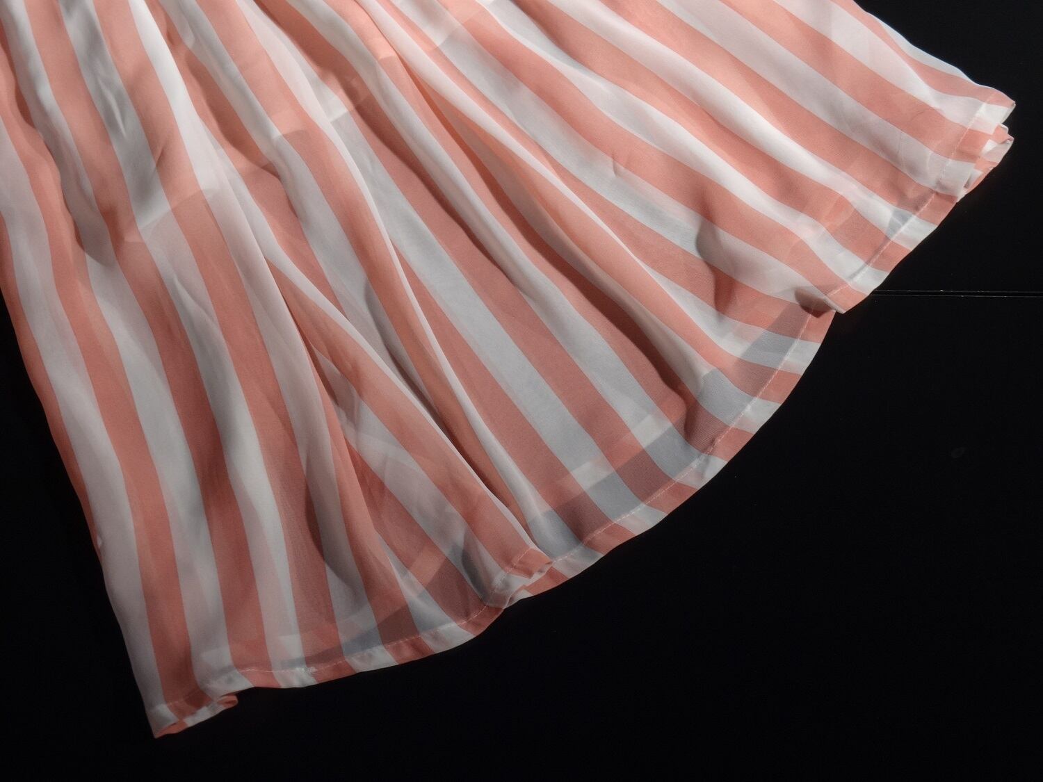 ピンクと白のストライプがプリティなロング丈のワンピース。襟元のロープ編み飾りやフリルと花モチーフがユニークで、シンプルなフォルムにアクセントをプラスしています。ウエストはゴム仕様。かぶるタイプ。裏地つき。