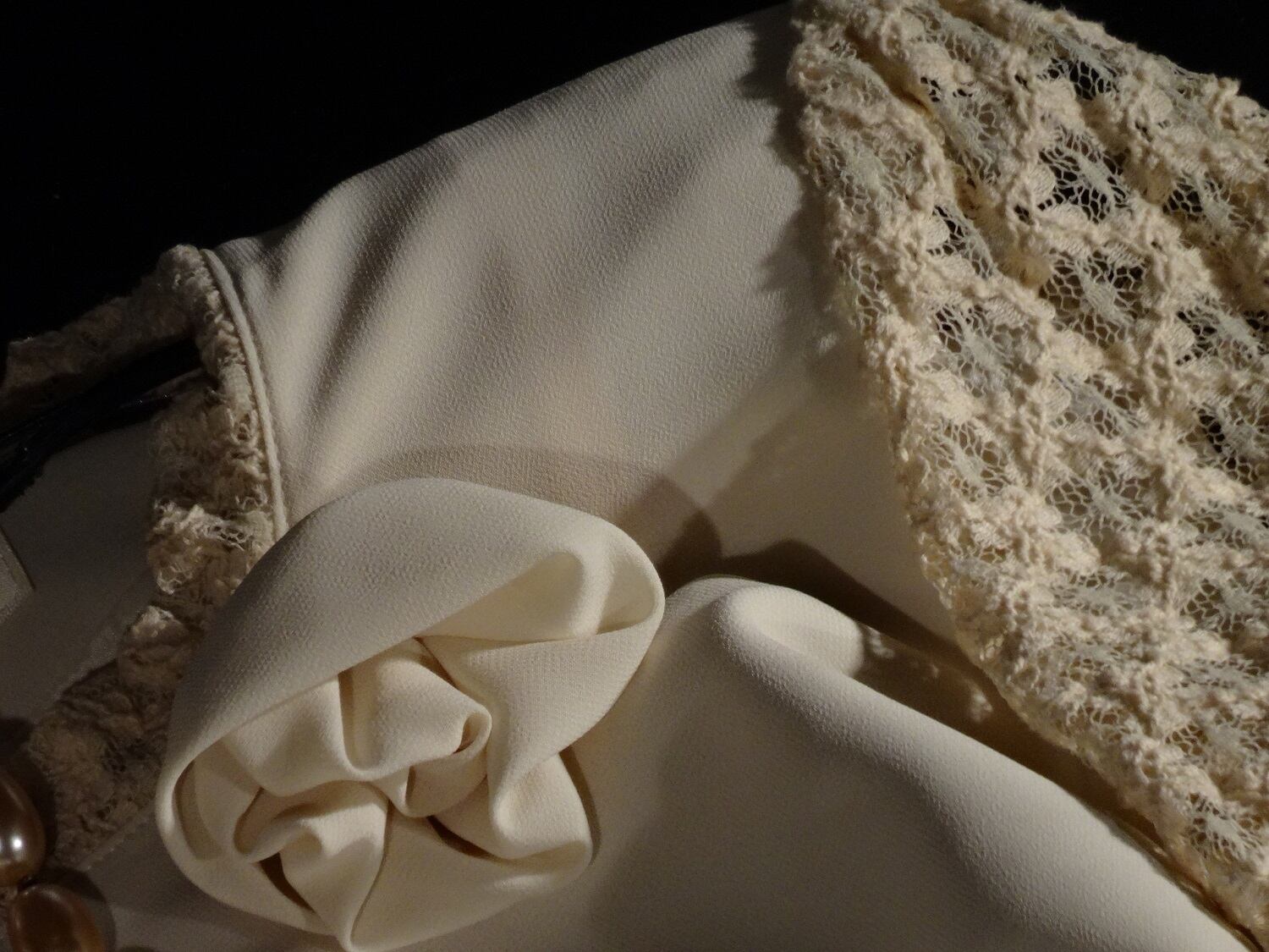 やわらかなクリーム色の花モチーフ付きワンピース。襟ぐりと袖は花柄のレース仕立て。袖先にはバイアスに共布の飾りリボンがあしらわれて華やかさで可愛い印象になっています。襟元の薔薇模様の花モチーフが取り外し可能。シルエットはシンプルですが、細かなところにお洒落な施しがされている、上品でフェミニンな一着です。裏地付。