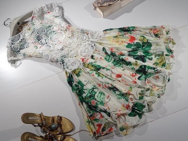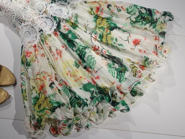 白地に爽やかなグリーンやピンク、赤の花模様がプリントされたスカート部分がプリーツ加工された涼やかなワンピースです。上見頃には鉤針編みのオーバーがセットされていて、ウエスト部分は花模様にカットされている凝ったデザインです。ピュアで品の良い印象を与えてくれる一着です。裏地有。