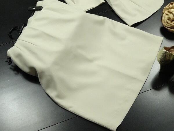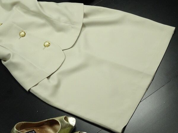落ちついたベージュのスカートとジャケットのセット。前ボタン留めで、襟元には立体刺繍をあしらっています。袖は長いシーズン通して着やす半袖。上品で優しい大人の女性を表現してくれる一着です。 裏地有り。ジャケットは前ボタン留め。スカート後ろファスナー有。