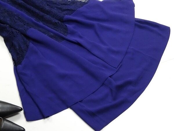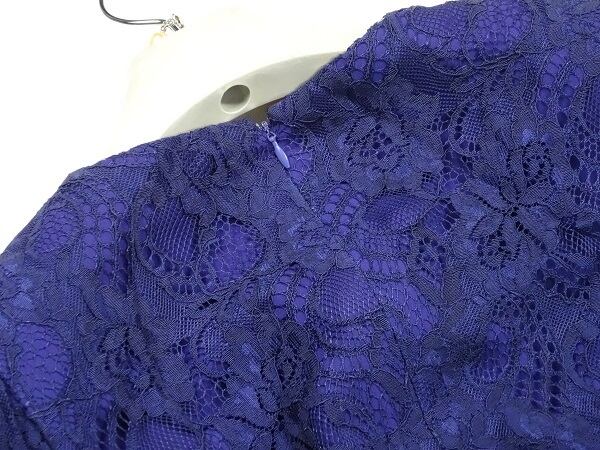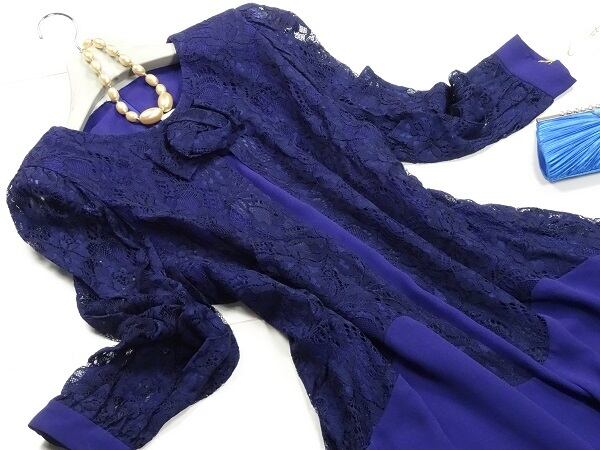 胸元花ブローチとレース飾りが美しいワンピース。襟から裾にかけて、紫のレースパイピングがあしらわれ、深い青紫に鮮やかなアクセントになっています。胸元のブローチは取り外し可能。優しい中にフォーマルな印象をあわせもった大人の女性を印象付ける一着です。ペチコ-ト付。裏地付。日本製。