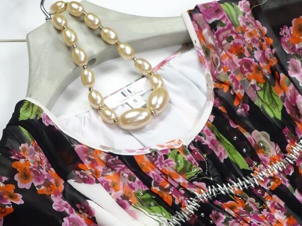 花柄のプリントとビーズ飾りがとてもオシャレで、可愛らしい女性を表現してくれる素敵なワンピ-スです。可愛いデザインで全体的に優しい感じに仕上げられています。裏地あり。