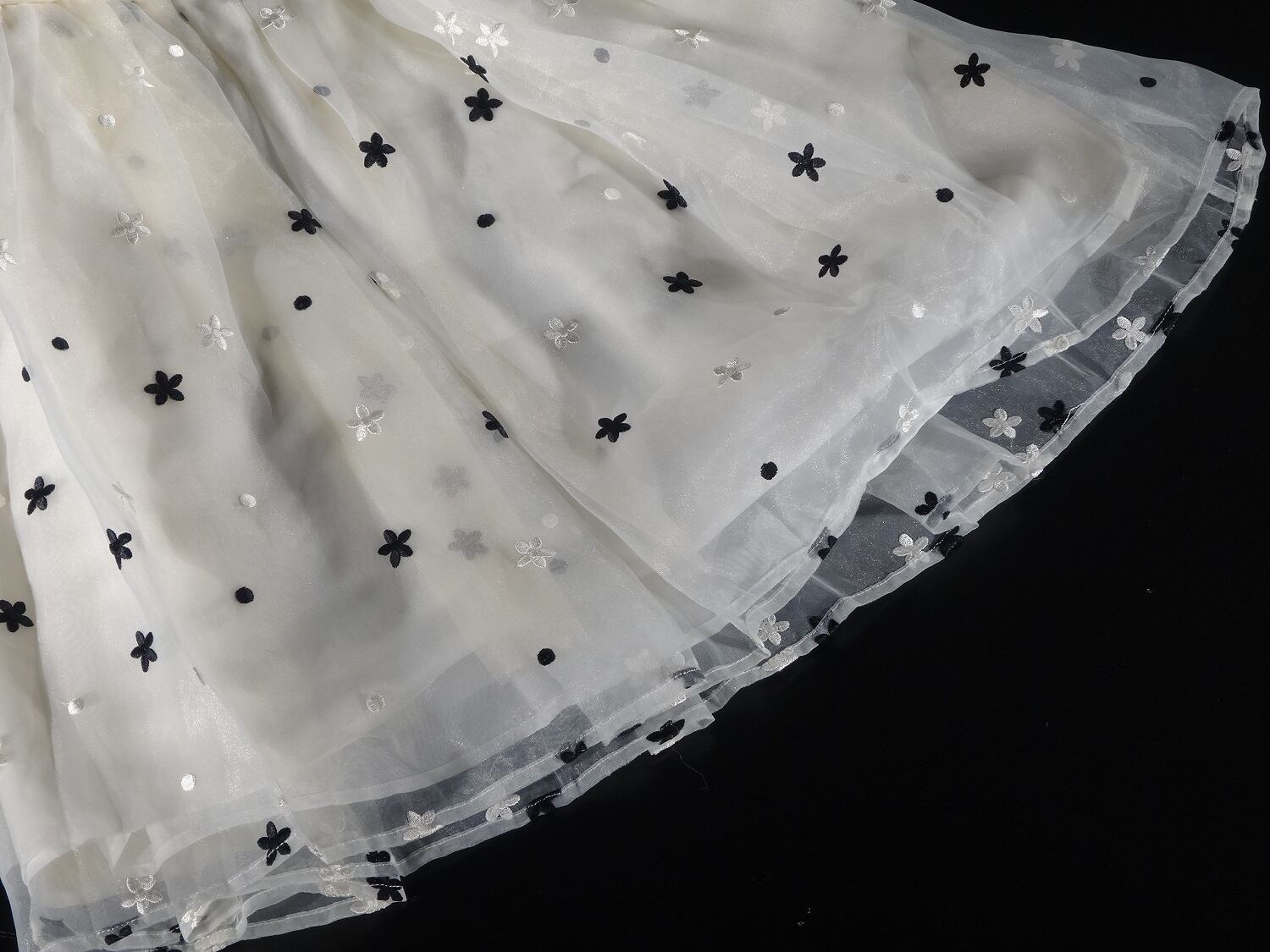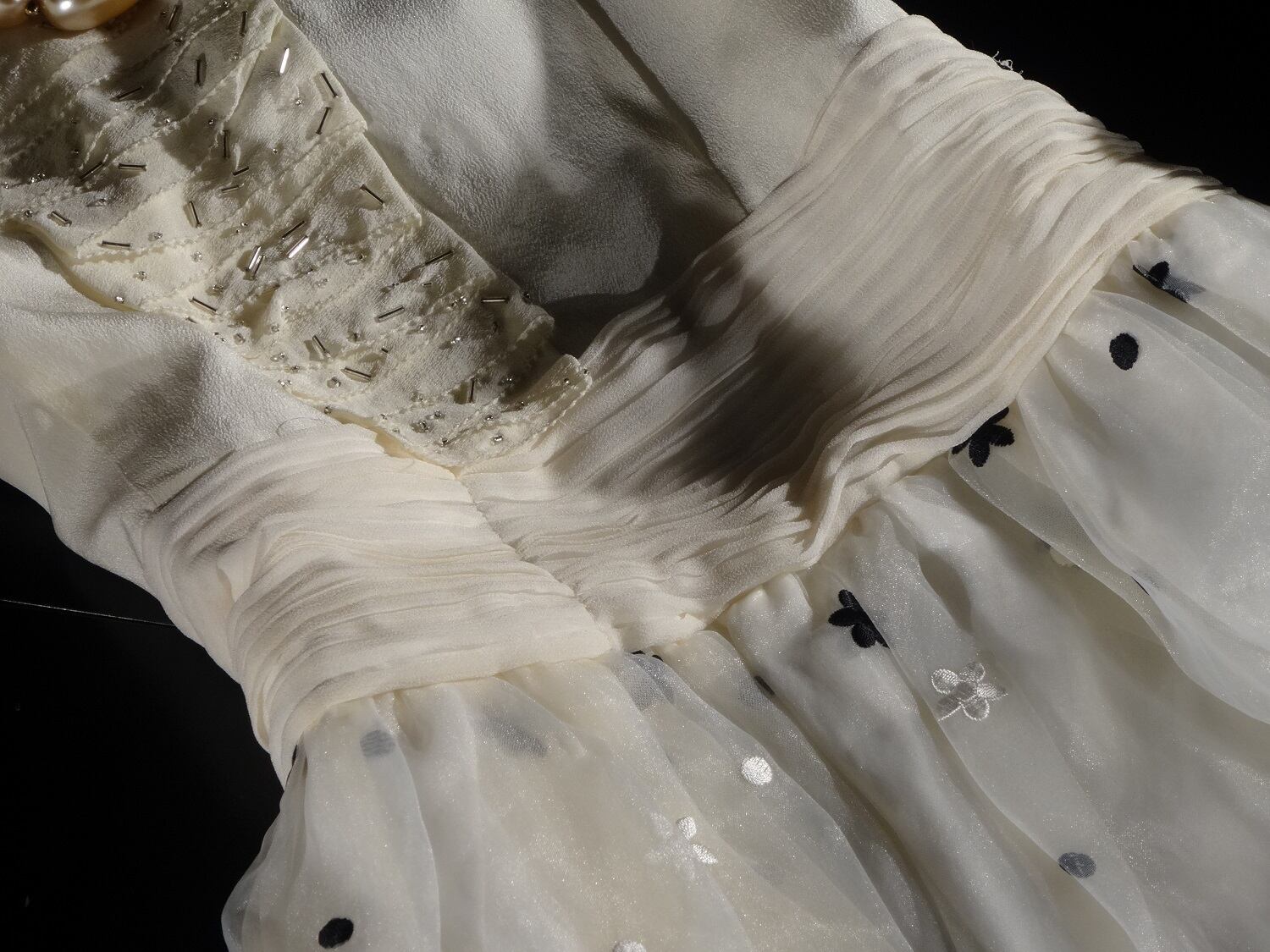 大きな丸襟と胸元にはビーズ飾り仕様。ウエストは細いタックが幾重にもとられ、スカート部分には大小の星形模様の刺繍がほどこされた上品なお嬢様テイストのワンピース。トップスとスカートの切り替えにウエストのタックがスパイスんように効いています。着心地の良い、上品な印象の一着です。ファスナーあり。裏地付。