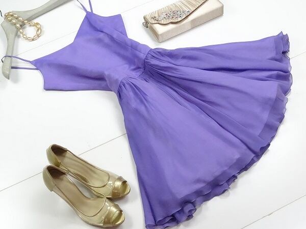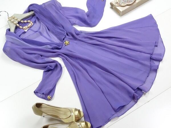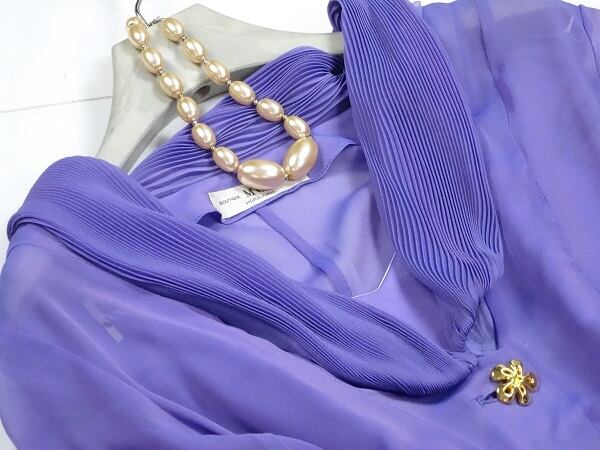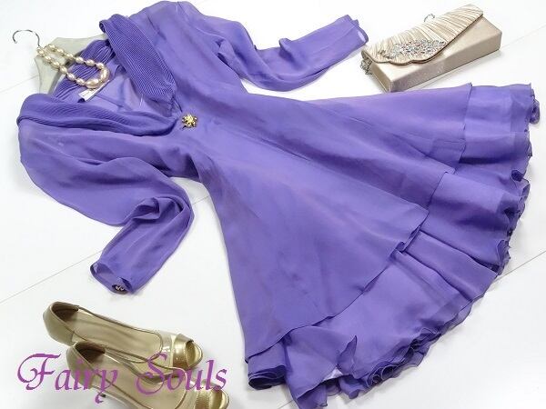 角度によって微妙に色合いの変るとても美しいシフォン生地のドレスです。スカ-トには、少量のバニエが入っていて美しい広がりを見せてくれます。裏地付。後ファスナ-有&小ホック留め有。