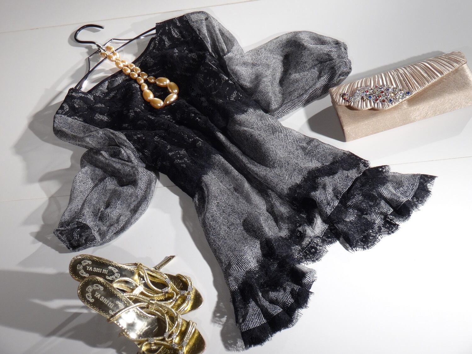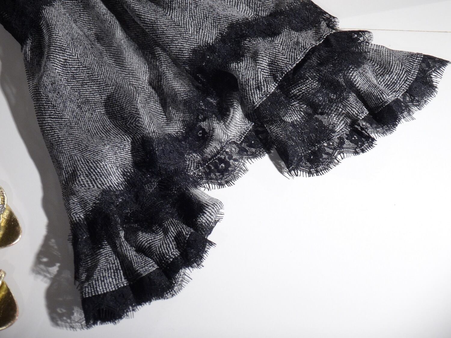 シルク100%しなやかなレースとシフォンのチュニック。フロントと裾周りに黒のレースをあしらい、イレギュラーな長さの裾がアクセントに。白と黒の繊細なストライプ柄が品よくやさしい印象を与えています。裏地なし。
