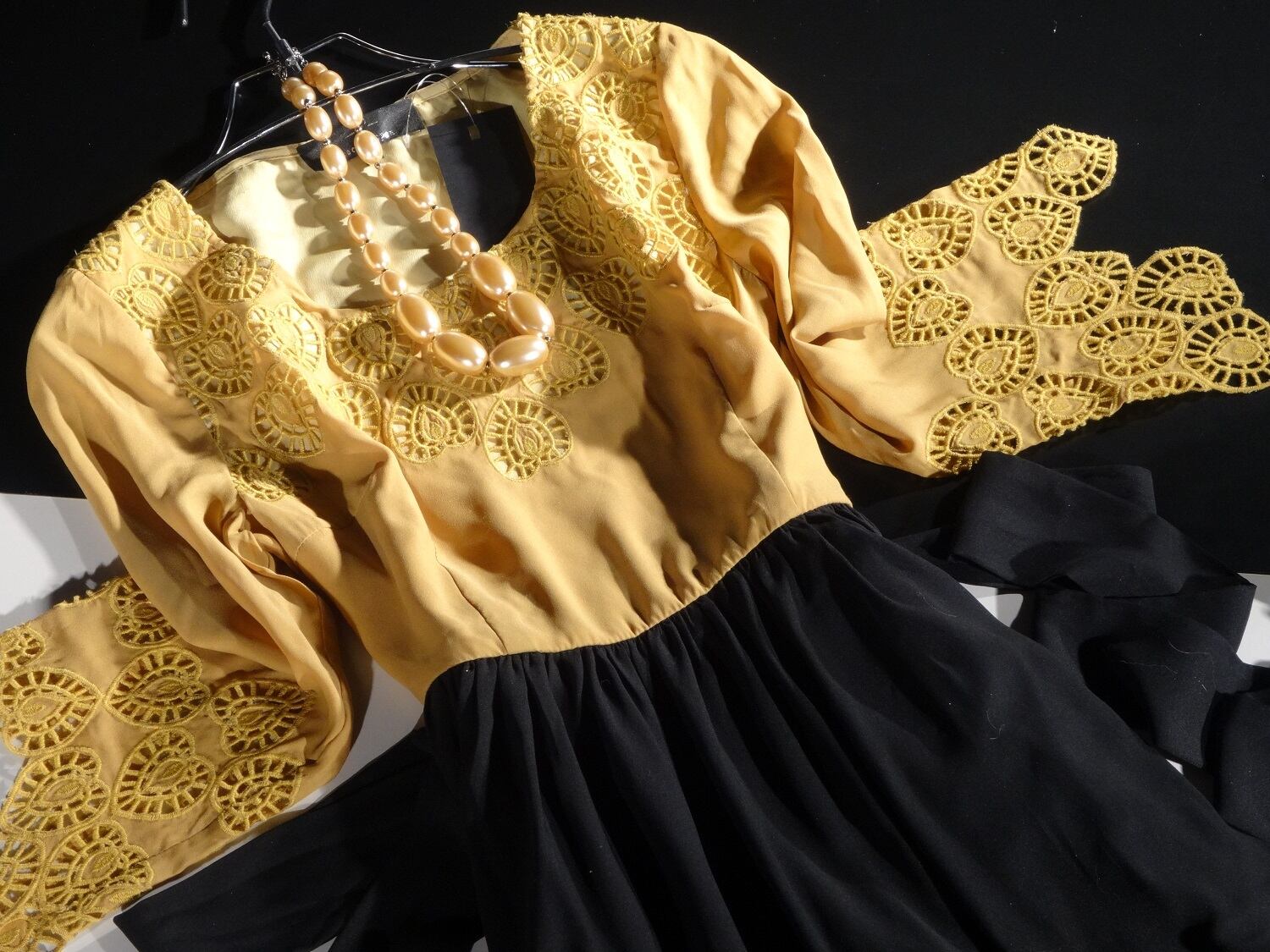 透かし彫りレース仕様が美しいシルク100%バイカラーワンピースです。トップスと袖は鮮やかなマスタードカラーにハート型リーフの透かし彫り。キュッとリボンを絞ったウエストから下のスカート部分は、鮮やかなトップスとは対照的なシックで落ち着いた黒に同じくハート型リーフの透かし彫りがあしらわれています。上品で大人の女性を印象付ける美しいデザインです。左脇ファスナー。裏地あり。