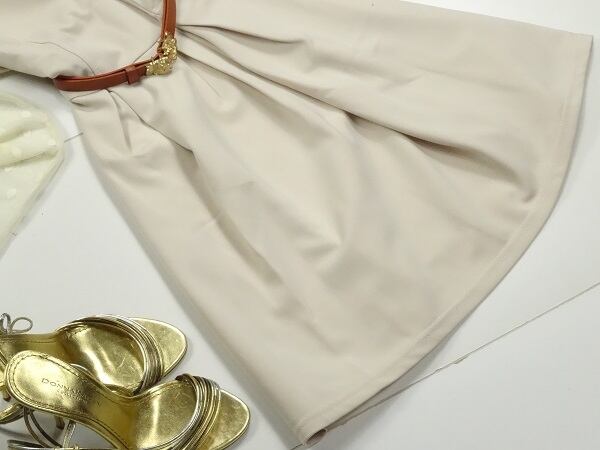 華やかでエレガントグッと開いたネックはアクセサリ-との相性もとても良いラウンドネック。ウエストから広がるラインもとても可愛らしいです。左ファスナー。裏地付。ベルト付。