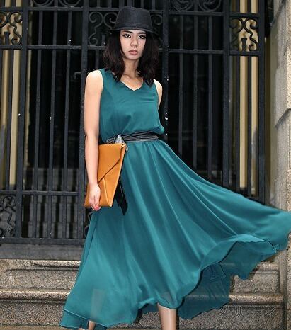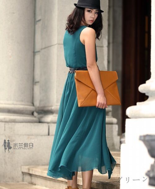シンプルなシフォンのワンピースです。トップスは優しいV字カットの胸元が涼しげ。ボトムは生地をたっぷりととり、ゆったりとした中に優雅さを併せ持ったシルエットになっています。シンプルなスタイルですので、ベルトやアクセサリー、羽織物などで様々なコーディネートを楽しんで頂けます。画像はグリーンに見えますが、実際は青に近い青緑色です。裏地付。