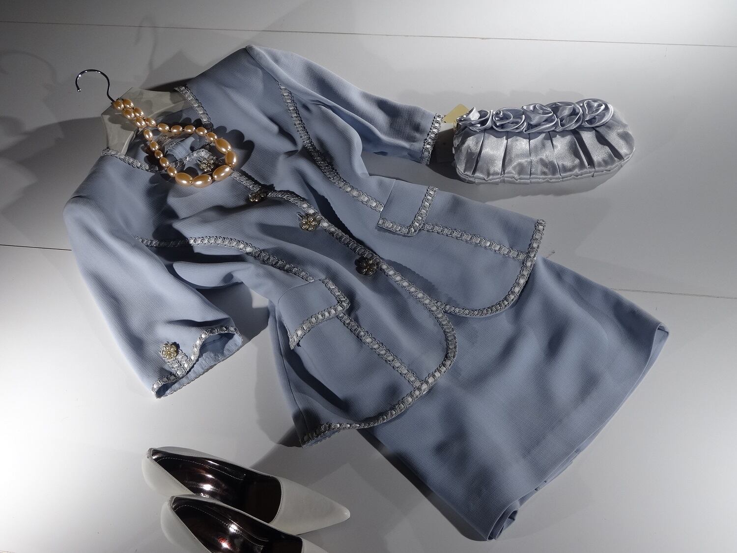 立体刺繍とからみあったリボンが印象的なジャケットとスカートのセット。ジャケットは半袖に肩パッド付。前4つボタン留め襟ぐりから袖さき、ポケット周り、裾にかけてリボンの縁取りが施されており、エレガントな印象に。シンプルなラインのスカートとあわさり、品の良いシルエットに仕上がっています。ワンランク上の大人の装いを演出してくれる一着です。スカートはサイドゴム仕様、後ろファスナー。裏地あり。日本製。