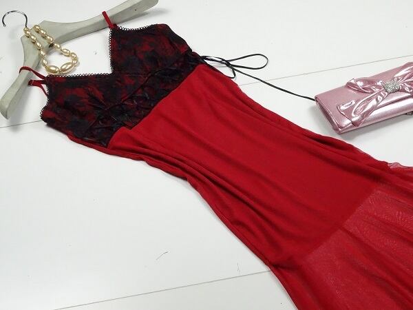 胸元にフラワ-レ-スが施されたデザインで胸元の編み上げリボンがポイント。膝下から下がシ-スル-で脚を魅せて女性度UP!!綺麗でSEXYな一着です。裏地なし。胸パット有。ファスナ-なし。