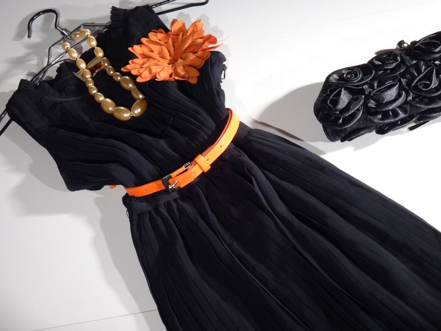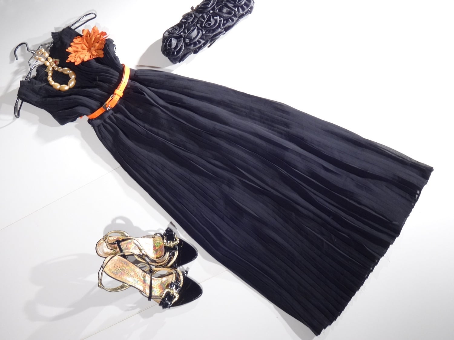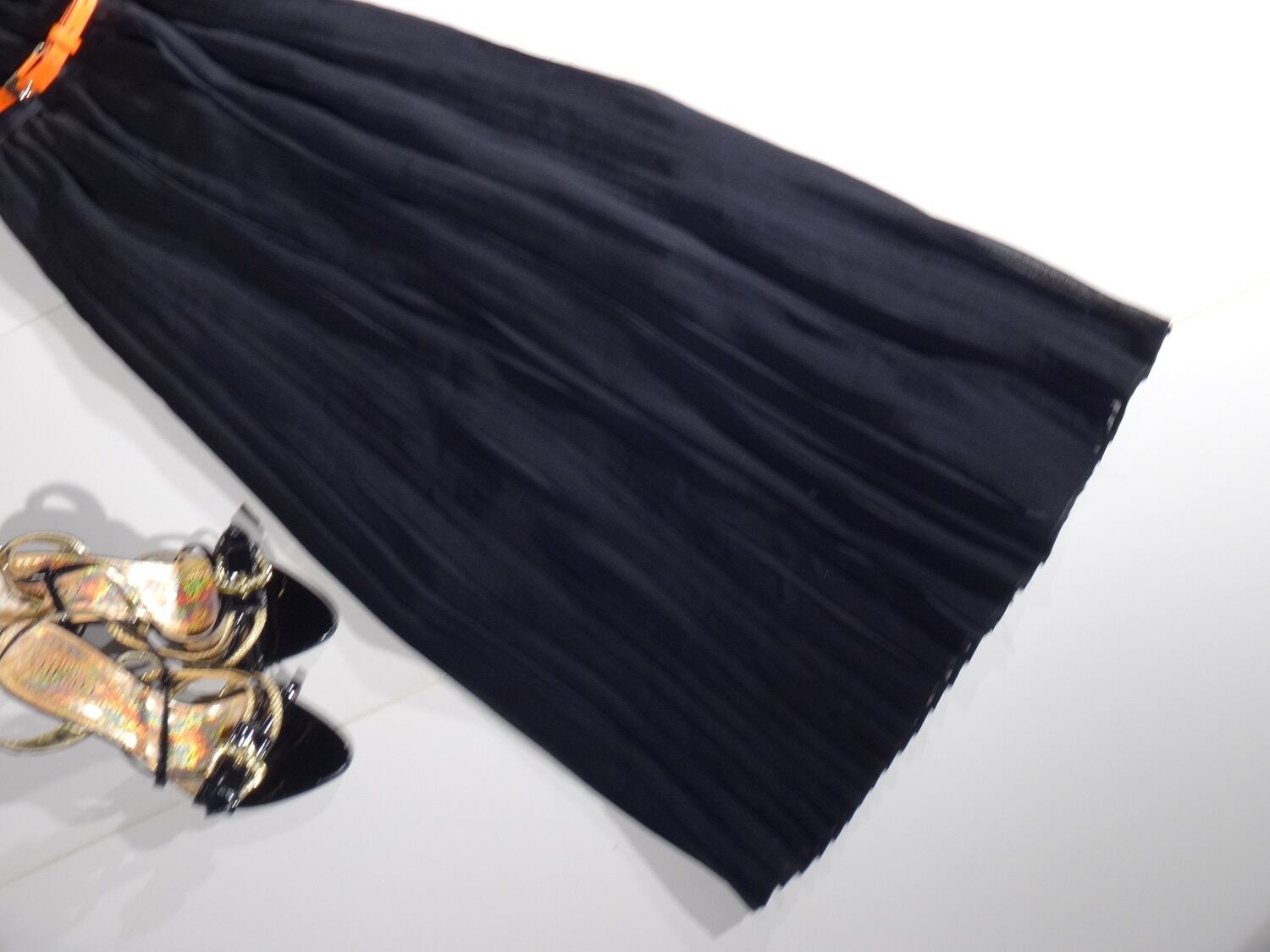 繊細なプリ-ツが縦のラインを強調していてとても綺麗なロングワンピ-スです!大きなお花のコサ-ジュがアクセントになっています。ウエストでの切り返しのデザインですのでプリ-ツの綺麗な繊細さが際立ちます。左ファスナ-有。裏地あり。ベルト付。