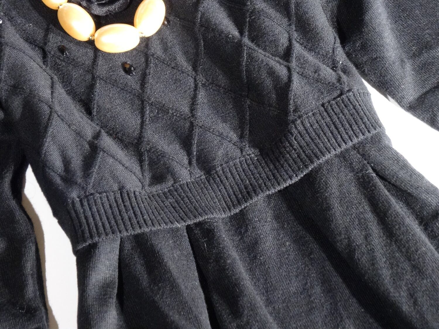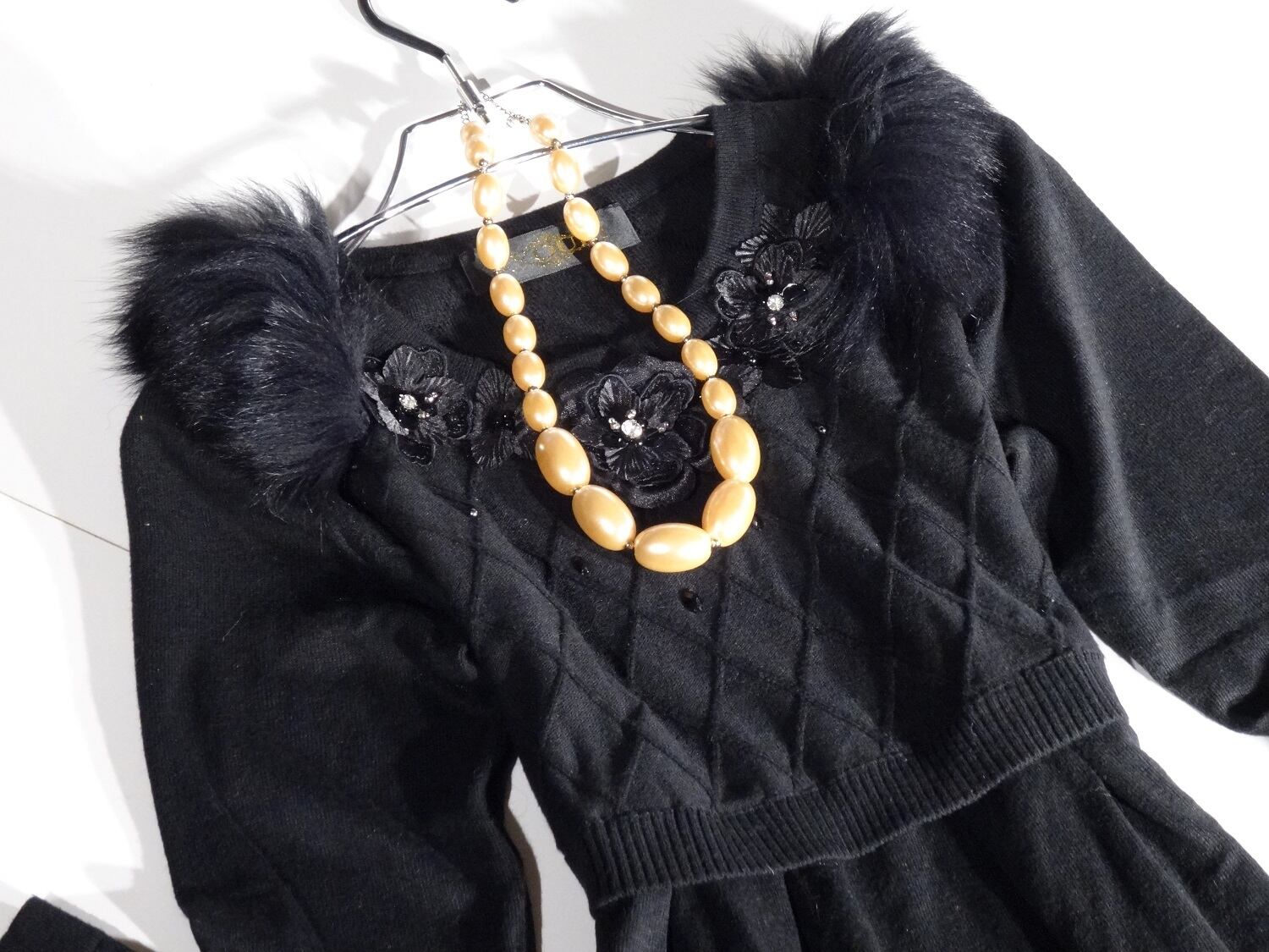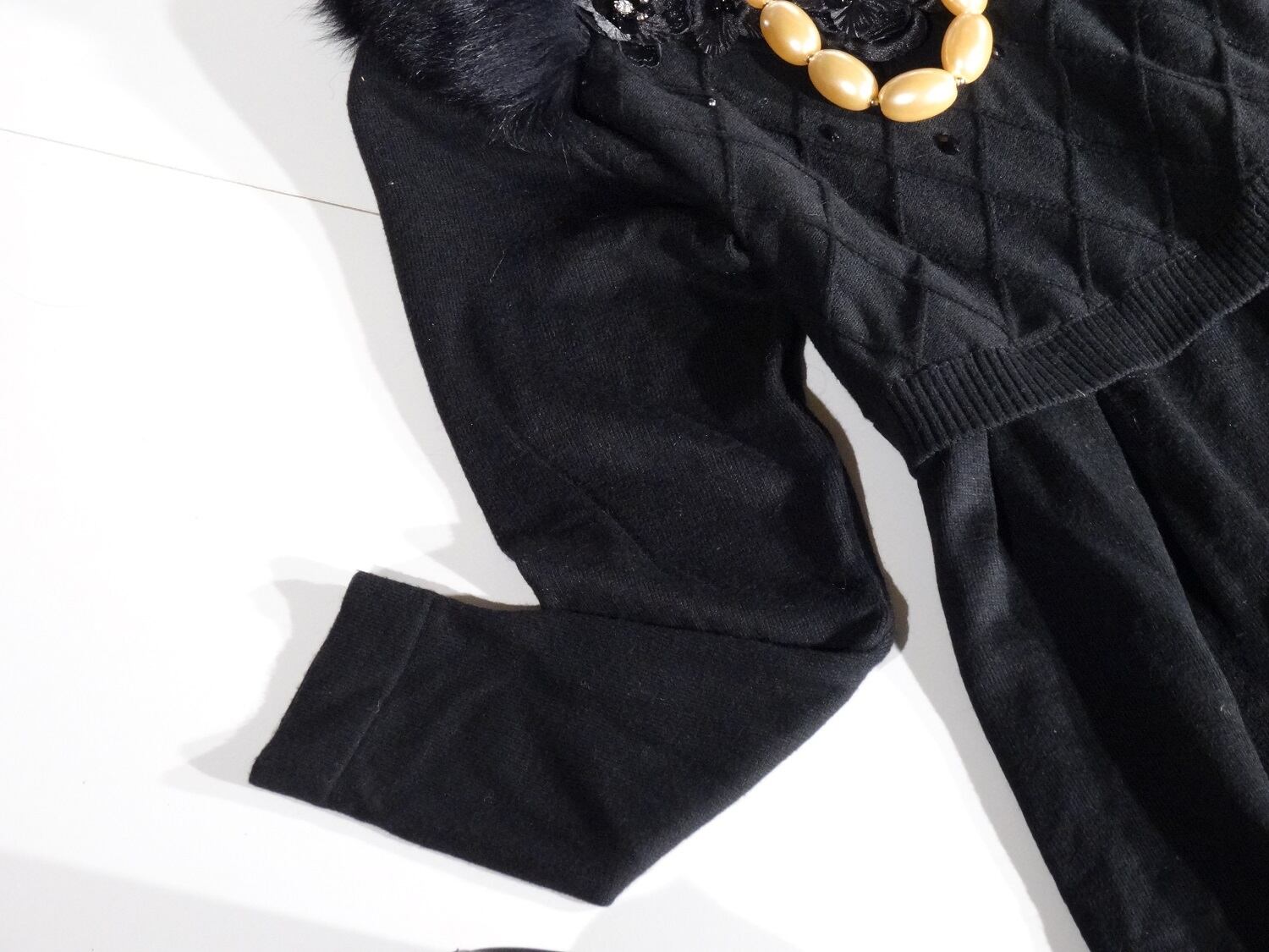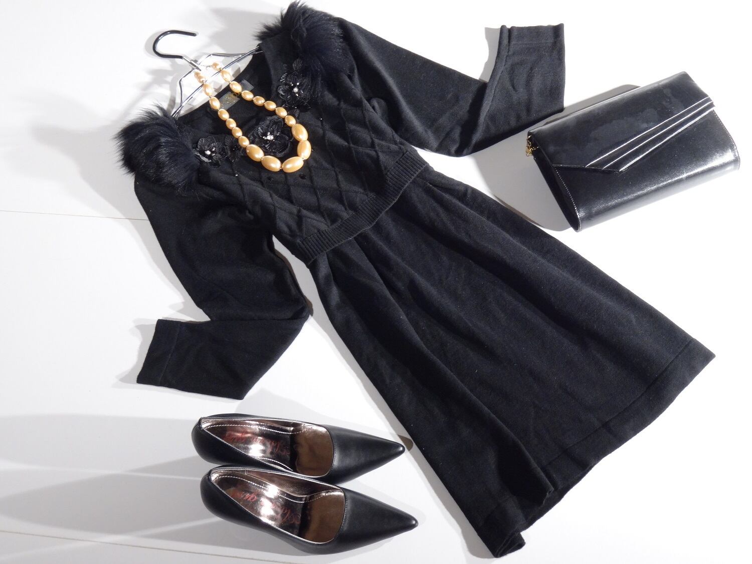 襟元にフェイクファーと花模様のモチーフあしらわれています。トップスは斜めの格子模様が編みこまれ、ウエストの切替で全体をスレンダーに見せているウール混のニットワンピースです。黒一色とシンプルでありながら、ポイントポイントに繊細なデザインがほどこされている、優しく品のある一着です。裏地なし。