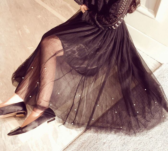 シンプルなふんわりチュ-ルレ-ス膝丈スカ-トです。裏地付。