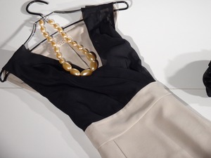 黒とベージュの落ち着いたバイカラーのワンピース。胸元カシュクールとストレートなラインが大人の女性の魅力を倍増させてくれます。左脇ファスナー。裏地なし。
