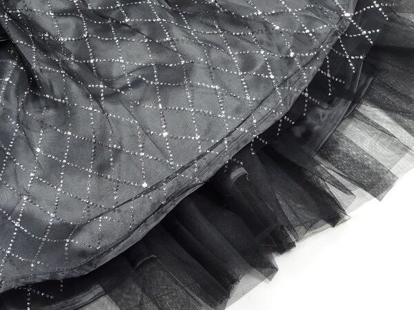 ダイヤ柄シルバ-ラメ付き黒色チュ-ルレ-ス&ダ-クシルバ-サテン生地の2枚重ねのドレスです。ウエストゴム。ダークグレ-地&シュ-ル付きバニエ付き、クリップ留めブラックコサ-ジュ付き、ブラックサテン地ベルト付、透明肩紐ストインには、バニエのチュ-ルが裾から見えるようになっています。サイドファスナ-有。