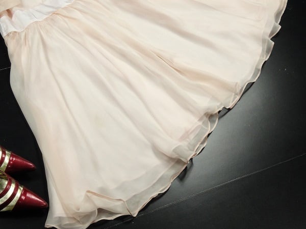 ボリュームのあるフリルがたっぷりと使用された華やかなドレスワンピース。襟元、胸元、袖にフリルが重なり、豪華な印象を与えています。やわらかなシルクシフォンがやさしく可愛いミニドレスとしても着て頂ける一着です。右脇ファスナー。裏地あり。