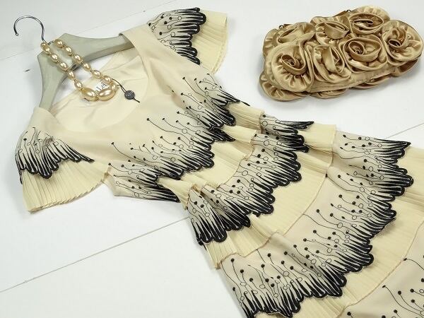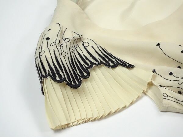 POPな刺繍と繊細なプリーツがレイヤーを形作っている凝った仕様の半袖ワンピース。袖口もプリーツになっています。背中側は裾に刺繍があしらわれている他は、クリームカラーの生地一色でシンプルなデザイン。シルクのさらさら感が着心地の良い、上品な印象の一着です。左脇ファスナー。裏地付。