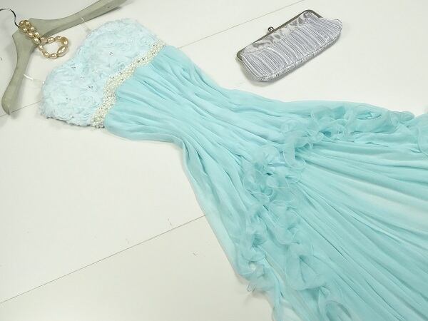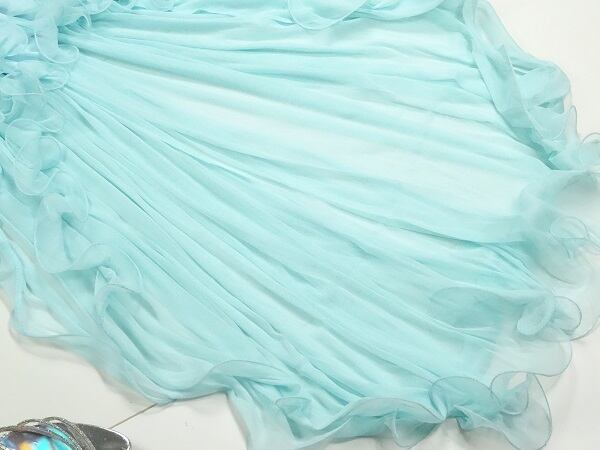高い位置での切替でスタイル抜群にみえます。綺麗なカラ-で裾は、サテンとシフォンの切り替えです。胸元の大量パ-ルがとても豪華です。裏地有。