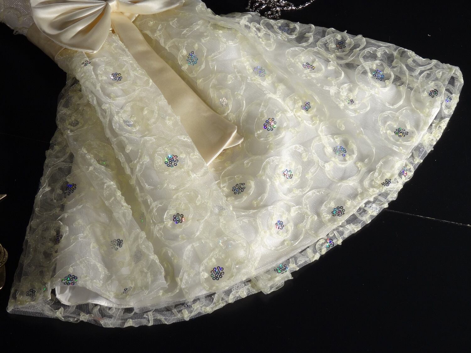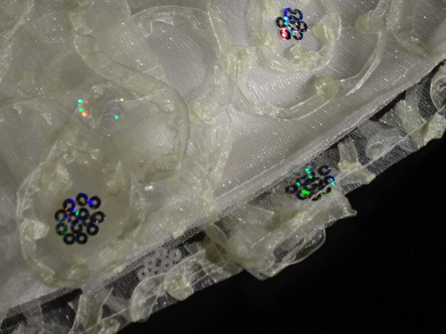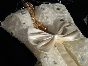スパンコ-ルのあしなわれ光の当たりでキラキラ光る女性らしいドレスです。オーガンジ-に覆われ高級感を演出してくれています。パーティ-や結婚式など目を引く事間違いありません。裏地付。