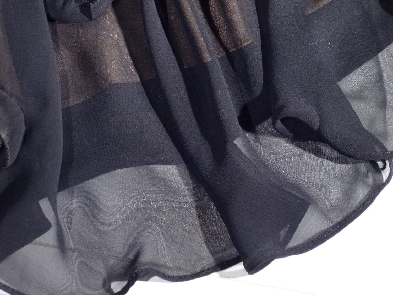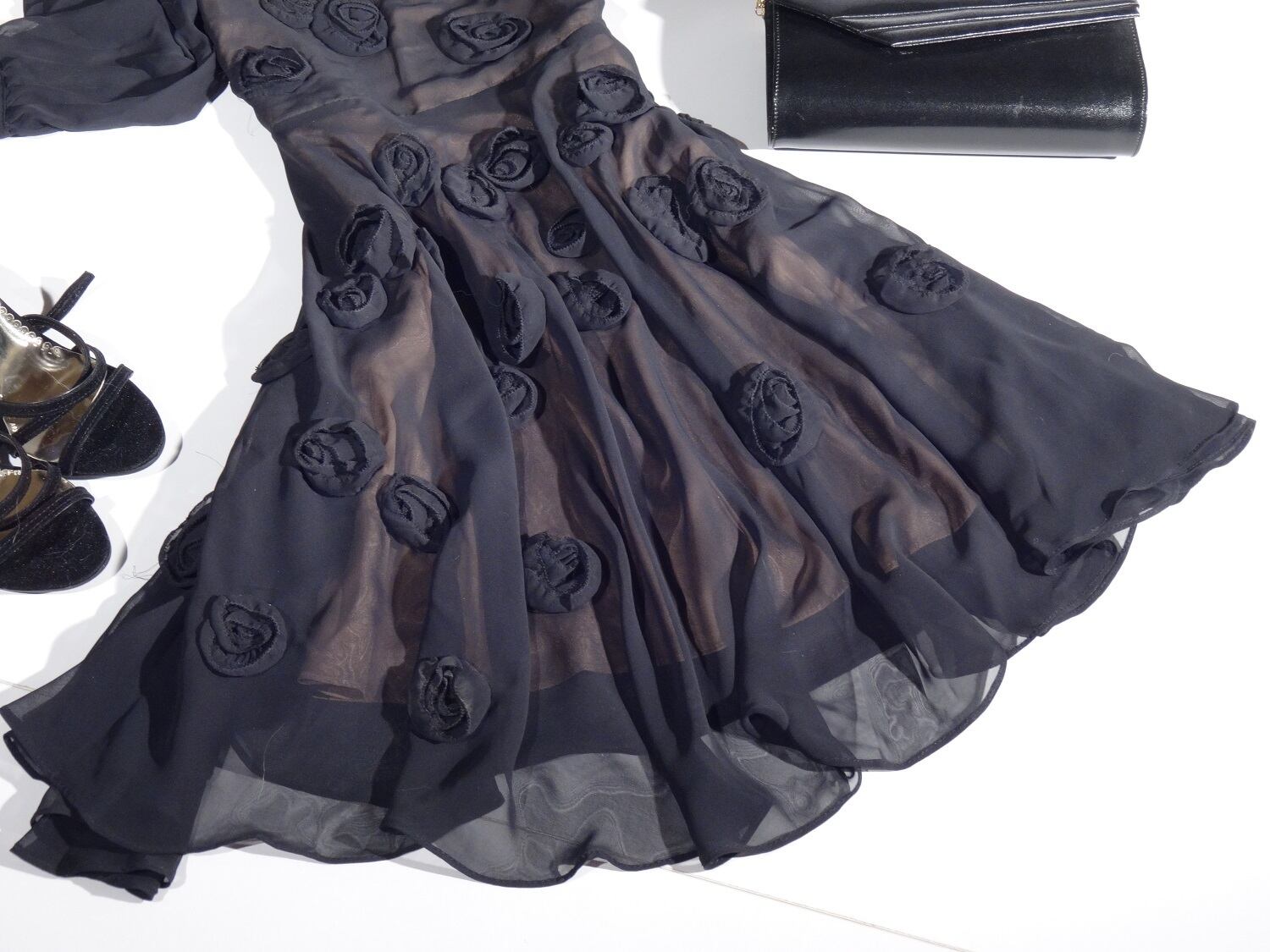 黒バラのモチーフがちりばめられたシルク100%のワンピースです。しなやかで透け感のある生地の上に黒いバラのモチーフがふんだんにあしらわれています。裏地のゴールドブラウンカラーが上地を通してほのかに見えて不思議な色合いを作り出しています。花のモチーフで華やかな表とは反対に、背中側はモチーフなしのシンプルにシックなデザインとなっています。左脇ファスナー。裏地付。
