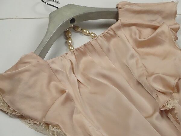 シルクのような質感とシルバ-の色彩のとても美しいドレスワンピです。袖部分の流れるようなフリルが大変女性度UPです!!裏地有。