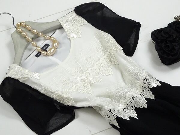 透明感のある素材使いと、繊細な刺繍に上品なスパンコ-ルもとてもオシャレで、しぐさを優雅に見せてくれる贅沢なお洋服です。ファスナ-有。 裏地有り。