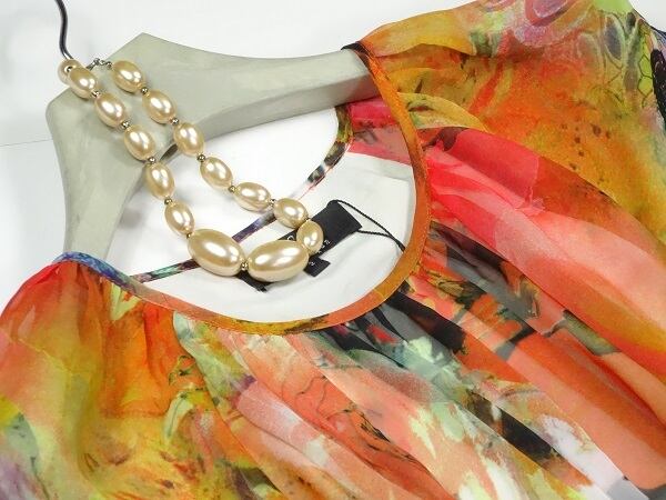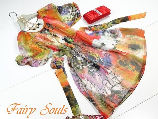 ふんわりシフォン生地を使用したプリントが魅力的なシフォンワンピ-スです。着心地もとても良くこの一で華やぎます。ウエストゴム。裏地あり。左サイドファスナ-有。