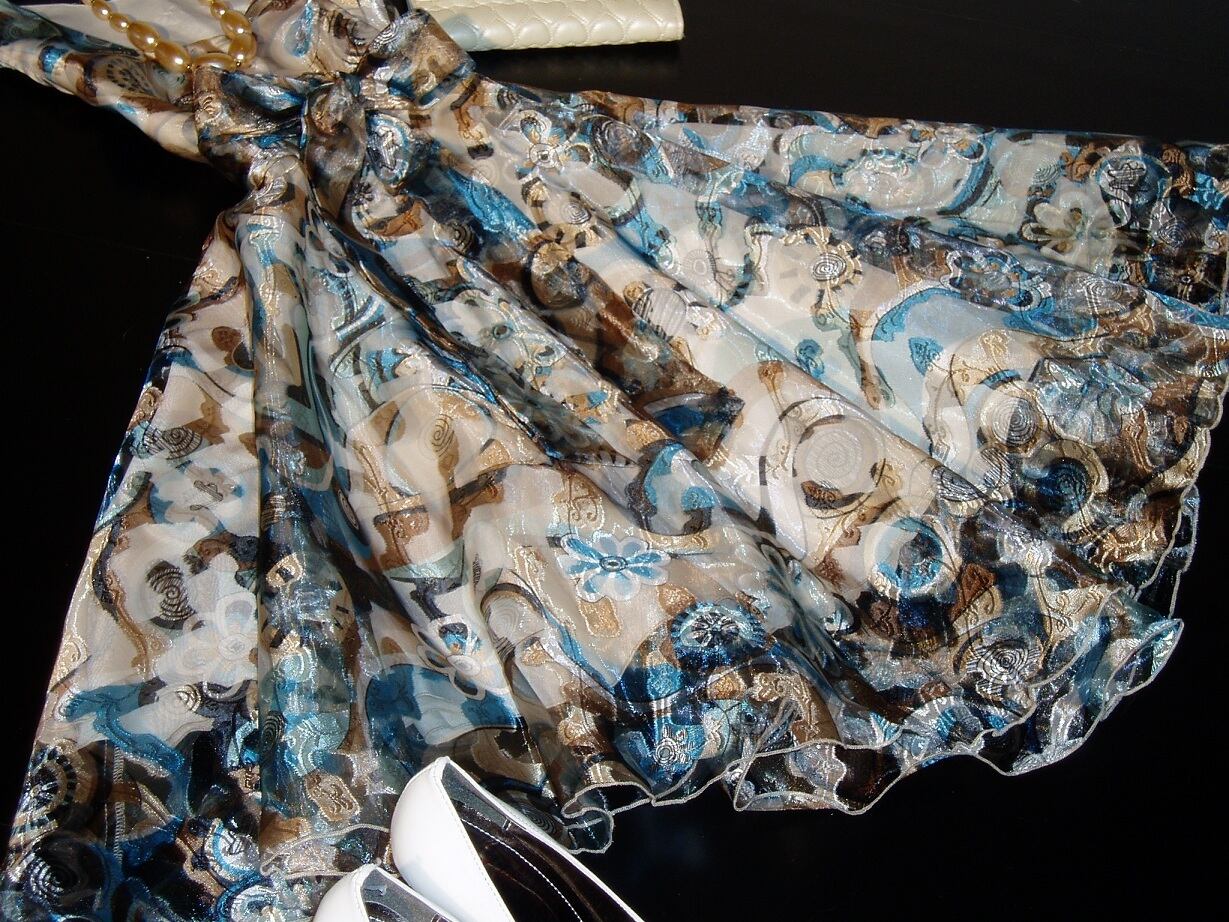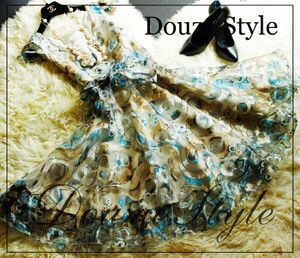 絵画のように美しい模様があしらわれた大変美しいワンピース。裾の透け感が優雅で上品な印象を与えています。ウエストで結ぶ共布のリボンがアクセントになっています。どんなシーンでも視線を独り占めしてくれる一枚です。裏地付き、サイドファスナー、ベルト取り外し可能。