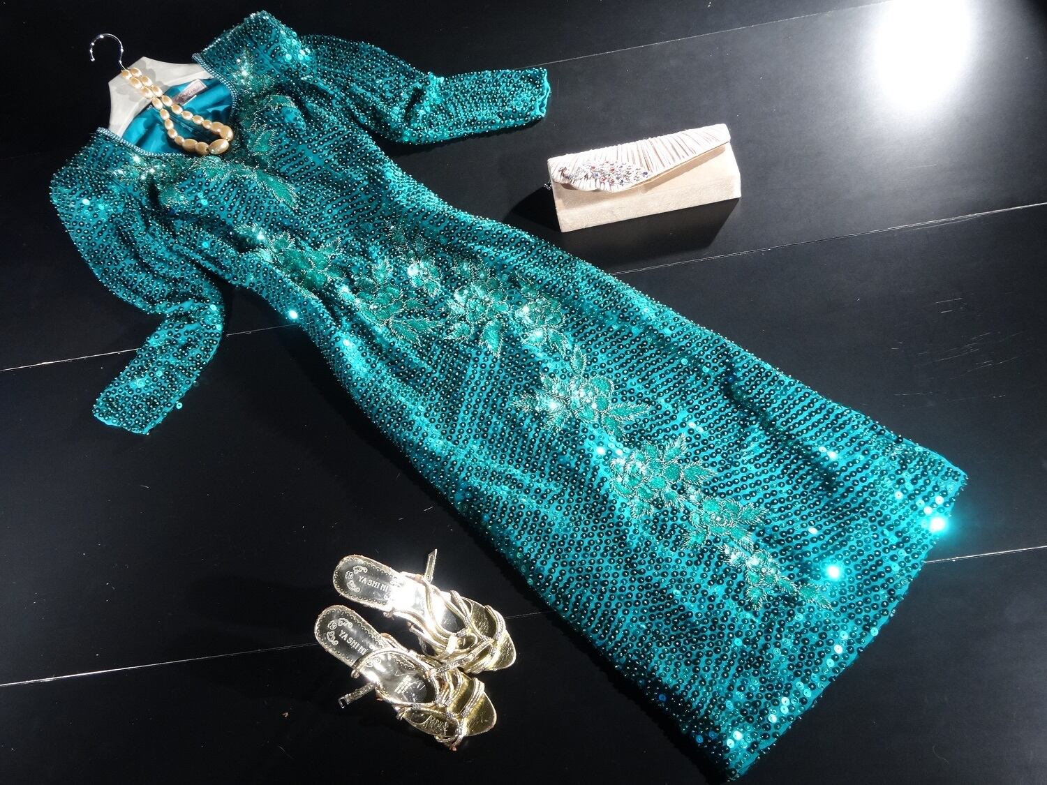 グリ-ンにキラキラ光る装飾を全体に施された豪華なドレスです。大人のエレガントさを感じさせてくれる一着です。ダンス・カラオケ・発表会・やステ-ジ衣装に最適です。裏地あり。背中ファスナ-あり。