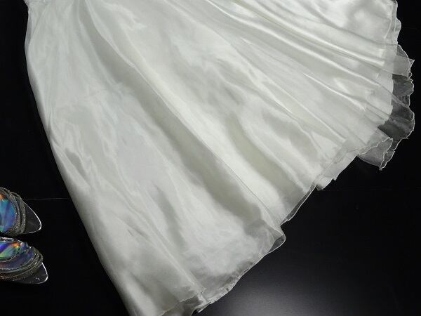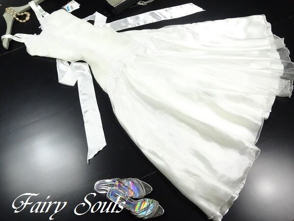 サテンオ-ガンジ-のキラキラ光る素材に胸元の刺繍がとても綺麗で裾に向かって広がるマ-メイドドレスがとても優雅です。透明感のある妖精のようなドレスです。裏地有り。後ファスナ-有。ストラップ調整可。胸パットなし。