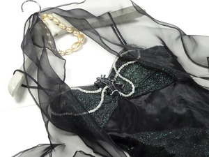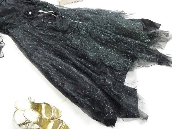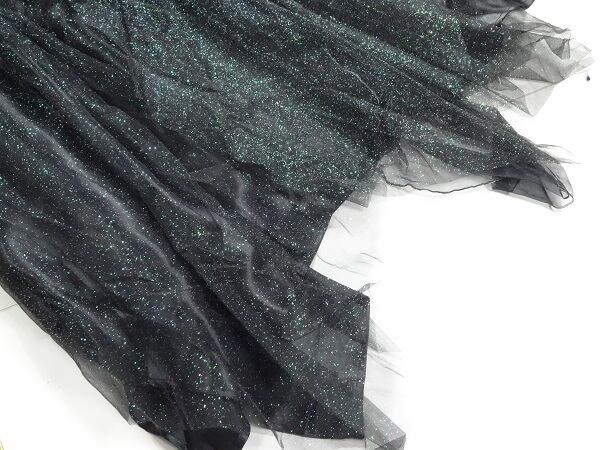 サテンの黒生地と総ラメのチュ-ルレ-スで、豪華なパ-ティドレスです。胸元には、パ-ルがあしなわれウエストには、リボンを使い上品にドレッシ-に仕上げられたアシンメトリ-のスカ-トは女性度間違いなくアップしてくれます。フワッとしたシルエットが大人っぽい印象を与えてくれそうです。裏地有り。ショ-ル付き。